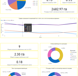 Дашборд для фермера забезпечує комплексною інформацією про структуру, стан та характеристики сільськогосподарських земель, склад, стан та розвиток сільськогосподарських культур, а також дозволяє прогнозувати врожайність, знизити витрати підприємства на різного роду операційні процеси (внесення посівного матеріалу, добрив, витрат палива тощо).
